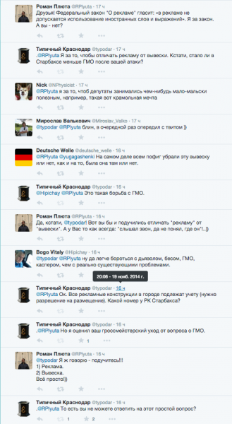 19 ноября Плюта объявил у себя в Твиттере об успехе операции: мол, Старбакс вслед за обращением в ФАС снял «рекламу». У Плюты тут же спросили, стало ли в результате выпада в адрес Старбакса меньше ГМО в хипстерском кофе? Плюта по традиции ушёл в несознанку и проигнорировал вопрос.