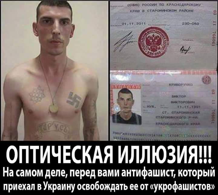 Виталий Криворучко — ополченец ДНР из станицы Староминской 1991 года выпуска, поехавший воевать против укропского фашизма на Донбасс в 2014 году. Оборудован свастикой на левой сиське. Надо полагать, идейный соратник Александра Мановицкого и Бабая.