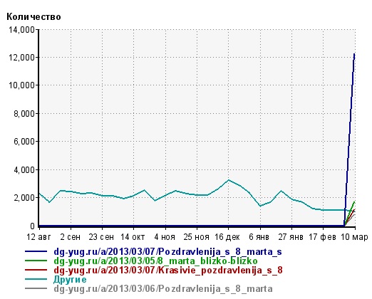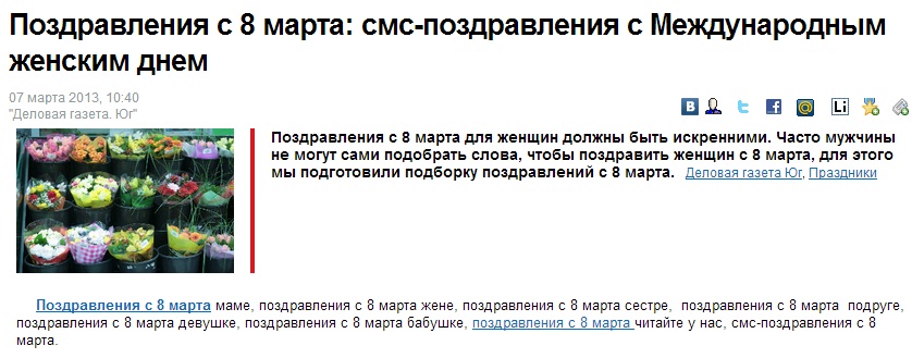 Остальные новости также не блещут разнообразием — из 8 самых посещаемых новостей шесть приходится на те или иные поздравления с 8 марта. Таким образом, из всего трафика за 4-10 марта по меньшей мере 65% приходится на удачно попавшие сообщения деловой газеты о том, как можно хорошо поздравить женщин с праздником через смс.