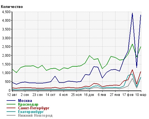 С 2 февраля резко увеличивается московский трафик. Пик его: 24 февраля (4426 уников). При этом московский трафик опережает краснодарский.
