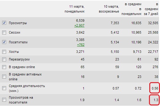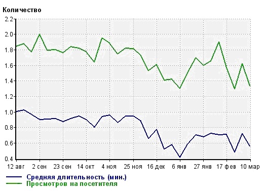 Но что же это такое: 1,33 просмотра на уника, 56 секунд пребывания на сайте. Как-то это слишком мало для новостного сайта с аналитикой и выкладками. Посмотрим по дате, как менялось это значание.